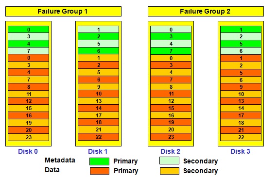 这里我们看到:这里有一个Normal Redundancy的磁盘组,他有2个Failure Group(FG1和FG2),每一个Failure Group中包含了2块磁盘(FG1中包含了Disk0和Disk1,FG2中包含了Disk2和Disk3)